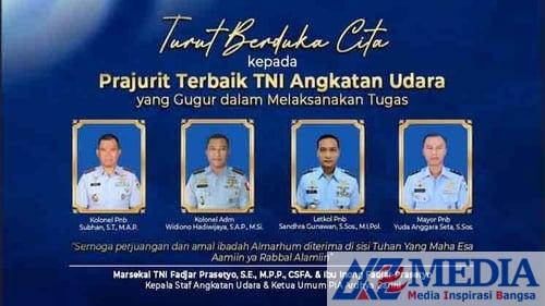 “Kepala Staf Angkatan Udara dan Ketua Umum PIA Ardhya Garini beserta seluruh keluarga besar TNI Angkatan Udara mengucapkan turut berduka cita kepada prajurit terbaik TNI Angkatan Udara yang gugur dalam melaksanakan tugas,” tulis akun Instagram resmi TNI AU (militer.udara)