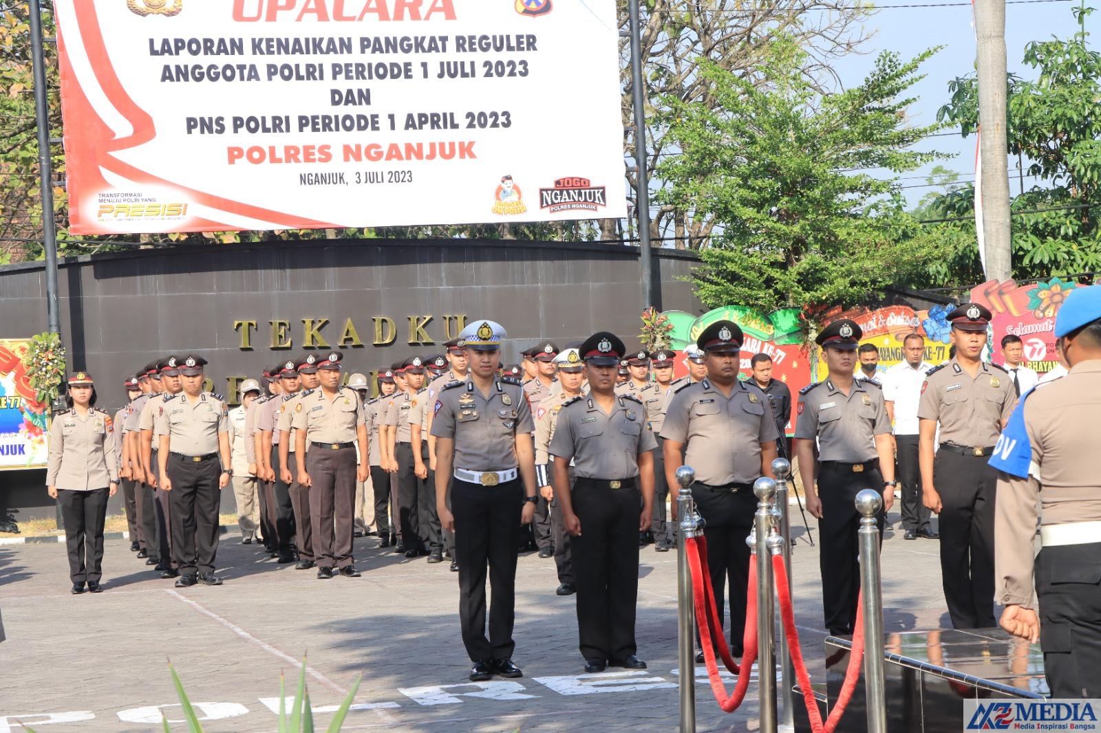 Nganjuk – Kapolres Nganjuk AKBP Muhammad, S.H., S.I.K., M.Si., memimpin pelaksanaan upacara kenaikan pangkat reguler anggota dan golongan setingakat lebih tinggi di lapangan apel Polres Nganjuk, Selasa (3/7/2023).