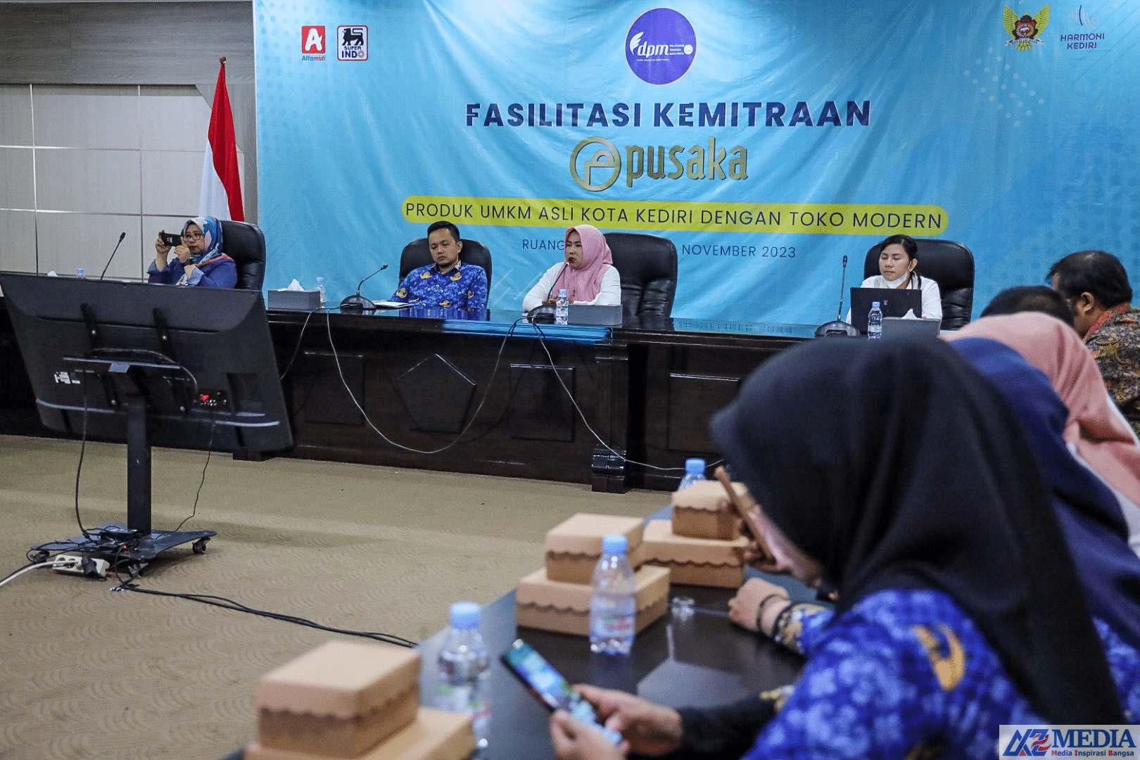 Tulungagung,AZMEDIA.CO.ID-Buka akses pasar yang lebih luas serta mendorong produk UMKM Kota Kediri masuki pasar modern, Pemkot Kediri melalui DPMPTSP menyelenggarakan kurasi produk, Rabu (29/11) di Ruang Joyoboyo Balaikota Kediri. Edi Darmasto, Kepala Dinas Penanaman Modal dan Pelayanan Terpadu Satu Pintu (DPMPTSP) Kota Kediri menuturkan kegiatan yang dikemas dalam Fasilitasi Kemitraan Pelaku UMKM dan Toko Modern dengan Branding Pusaka (Produk UMKM Asli Kota Kediri) tersebut bertujuan untuk memfasilitasi terciptanya kemitraan antara pengusaha menengah atau besar dengan pelaku UMKM di Kota Kediri.
