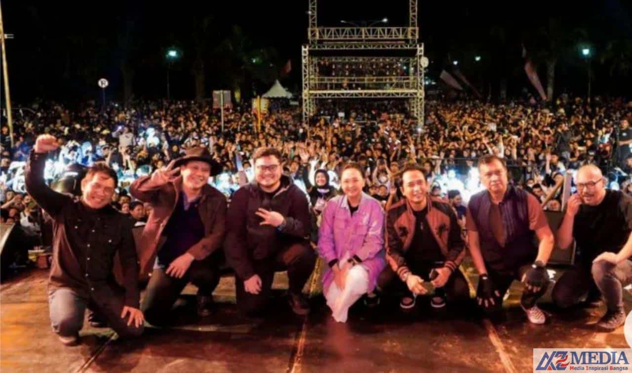 Kediri, AZMEDIA.CO.ID – Grup musik Padi Reborn dengan Bupati Kediri Hanindhito Himawan Pramana sebelum konser di area SLG Kabupaten Kediri, Jawa Timur, Sabtu (13/5/2023) malam.