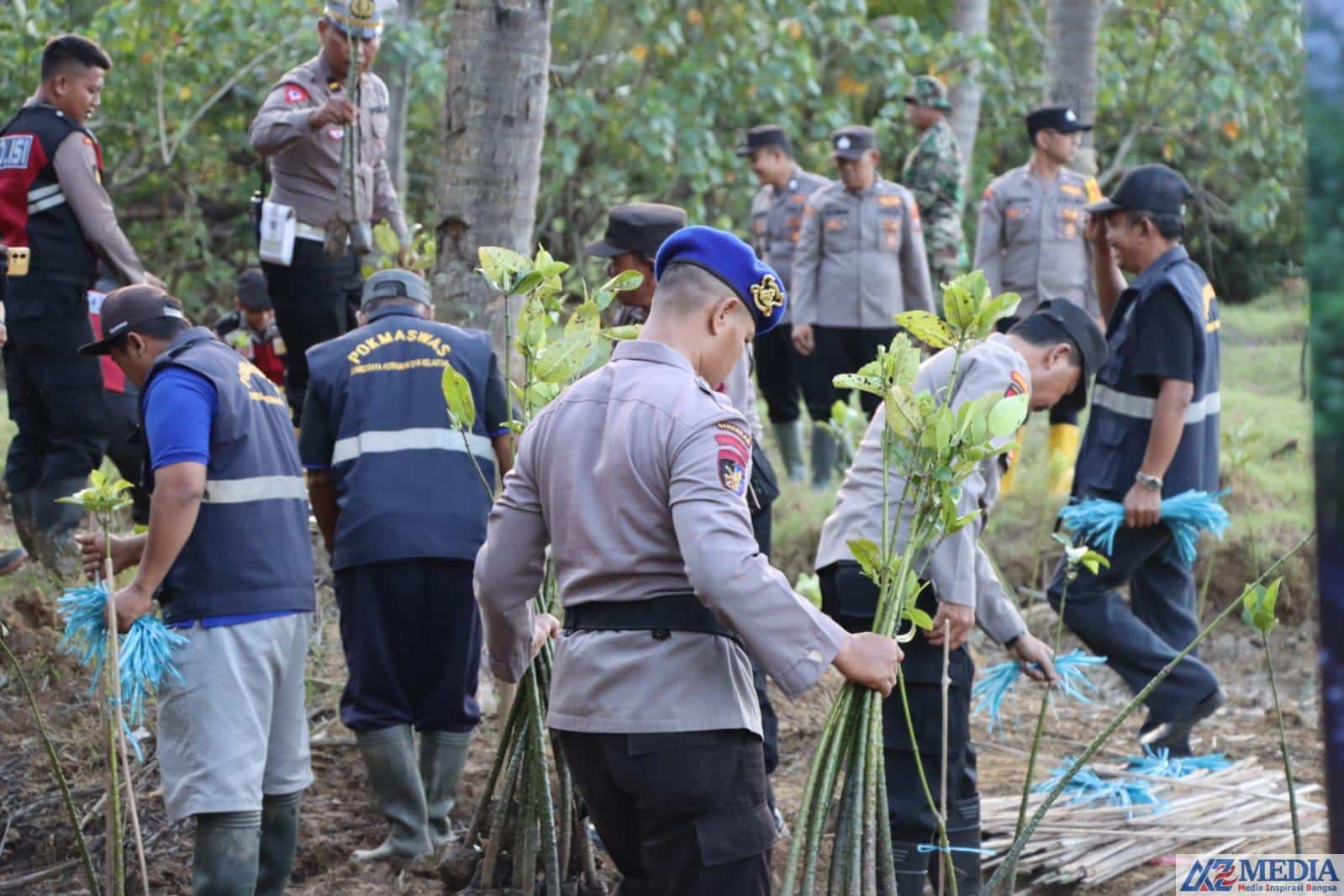 Dengan mengenakan seragam dinas lengkap ditambah dengan sepatu boot plus cangkul, AKBP Alith menggali tanah untuk kemudian memasukkan bibit mangrove di dalamnya.