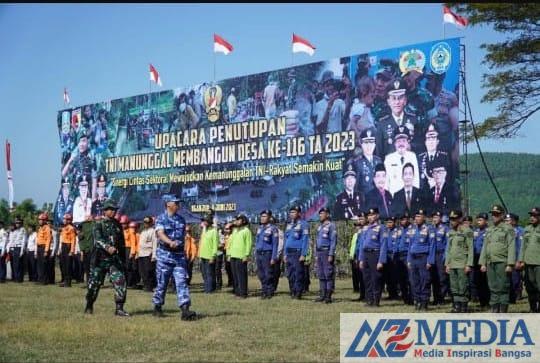 AZMEDIA INDONESIA, Nganjuk | TNI Manunggal Membangun Desa (TMMD) ke-116 resmi ditutup oleh kepala Dinas Potensi Dirgantara Kolonel Tek Suprijantono Mewakili Komandan Lanud Iswahjudi Marsma TNI Wastum, S.E.,M.MP.,MS(NSSS) dalam upacara penutupan yang diselenggarakan di lapangan desa Ngluyu,Kecamatan Ngluyu.