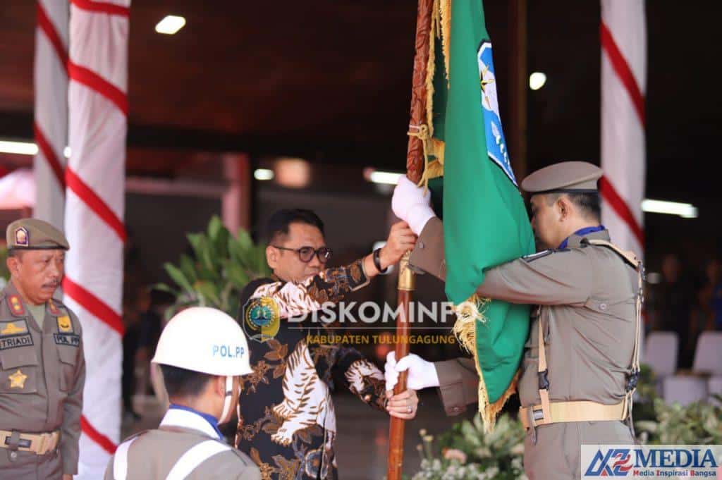 Prosesi penerimaan Panji dan Pataka Jer Basuki Mawa Beya dari Pemerintah Kabupaten Trenggalek selanjutnya ditandai dengan upacara serah terima yang dipimpin langsung oleh Pj. Bupati Tulungagung Dr. Ir. Heru Suseno, STP, MT.